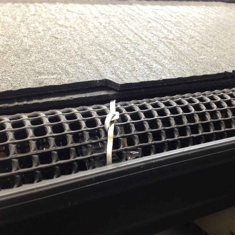 1)ポリネット固定金具をブラケット下面に通し、片方を瓦、水切りなどの隙間に差し込み、反対側は軒樋の前耳部で折り曲げ、仮止めします。
